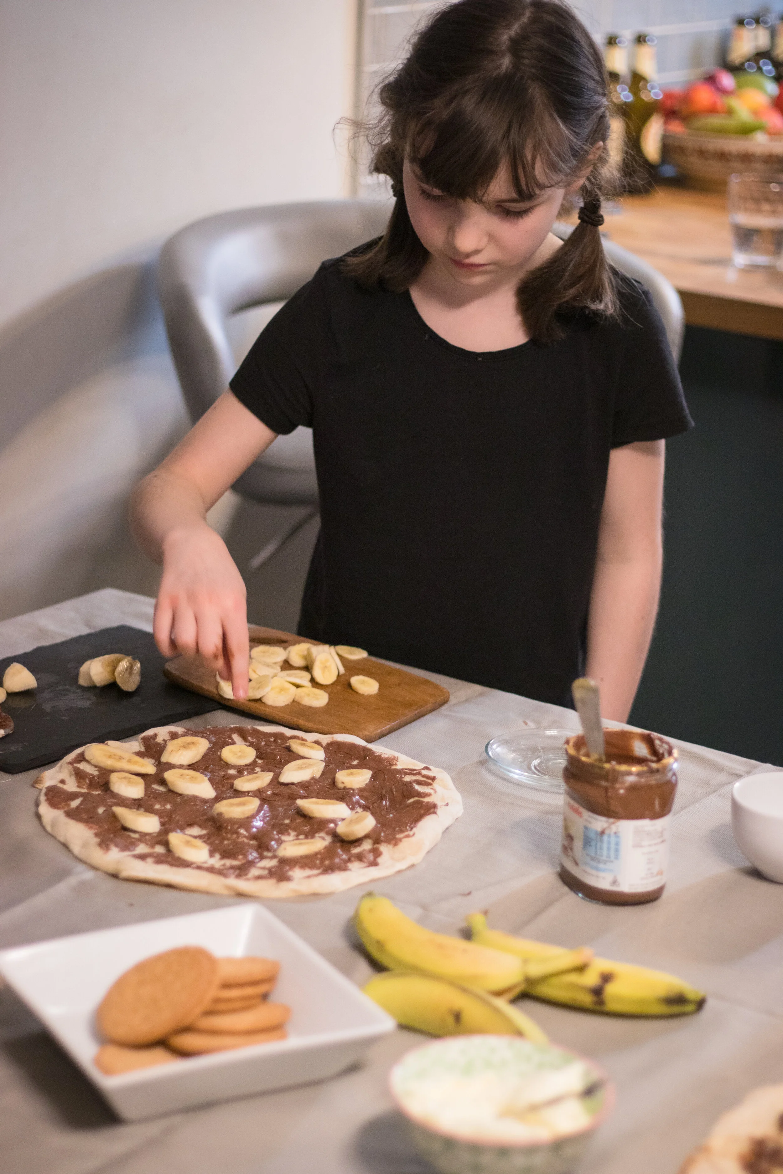 On the base spread your Nutella. Scatter banana and biscuit